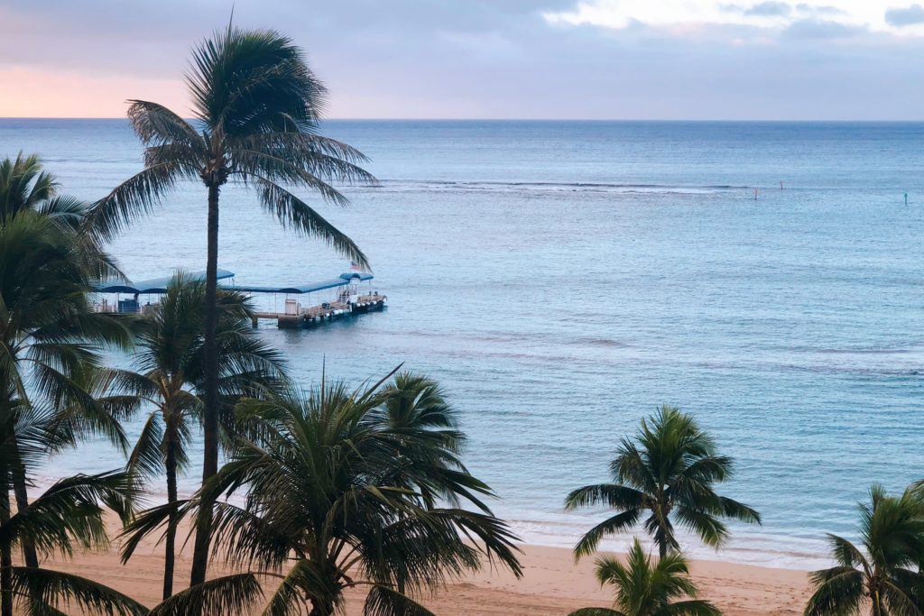 元旦の朝7時過ぎ!いつもなら散歩をしている人がいる時間帯ですが、この日は人けはありません。前日のカウントダウンの影響でまだ部屋で休んでいる人が多いのでしょうか?静けさの中、「神秘的」なハワイの朝を感じることができました。